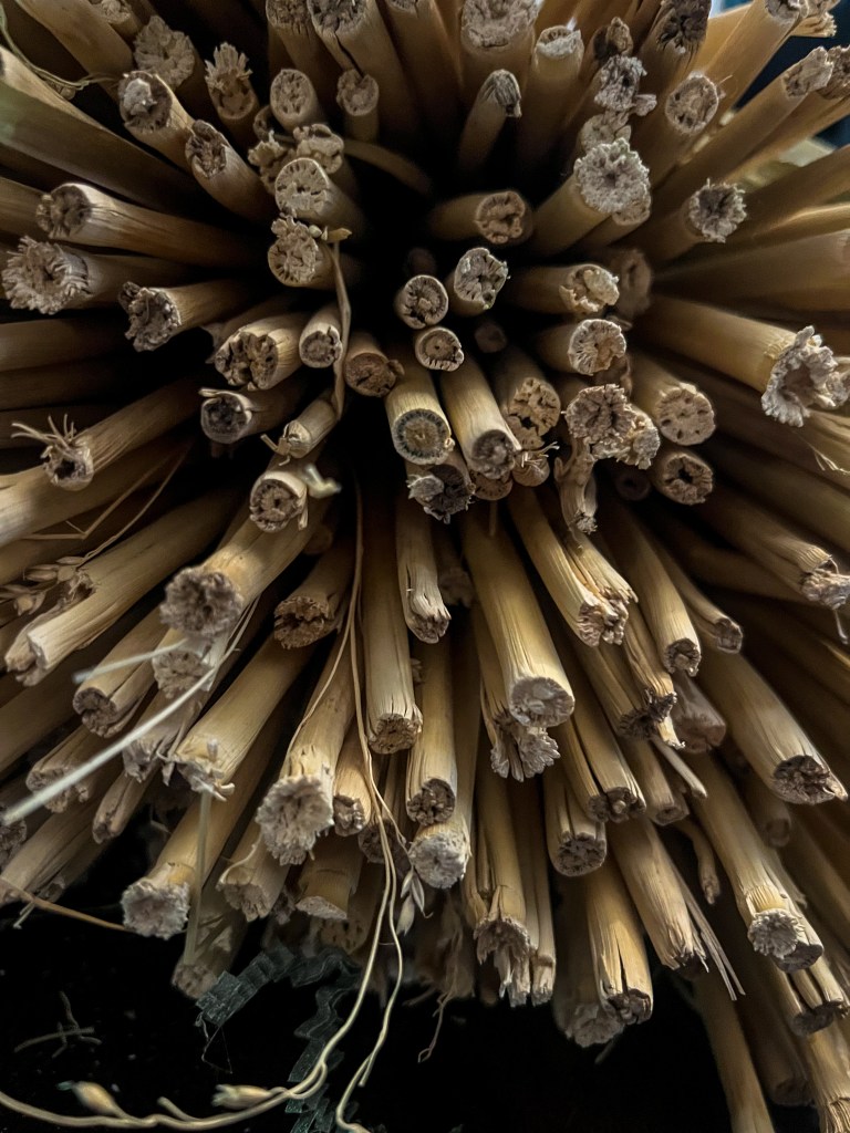 Three false starts later, my arms and shoulders and neck were exhausted, my frustration was high, my arm was covered in itchy hives, and our dining room floor looked like a haystorm had blown through. I hadn’t soaked enough broomcorn, was cinching with all my might but still failing to get the outer layer to stay in place, yet also somehow working everything too tight. “Why don’t you take a break,” Keith said, as I contemplated launching the whole thing into the woods or lighting it all on fire and calling it a “ceremonial cleanse.”